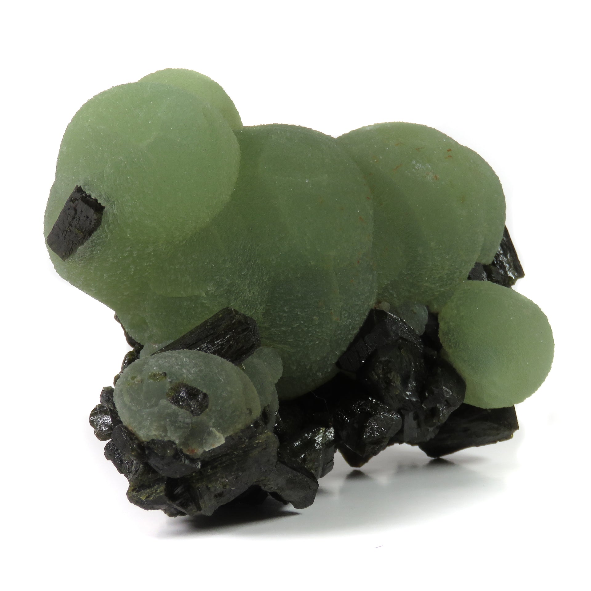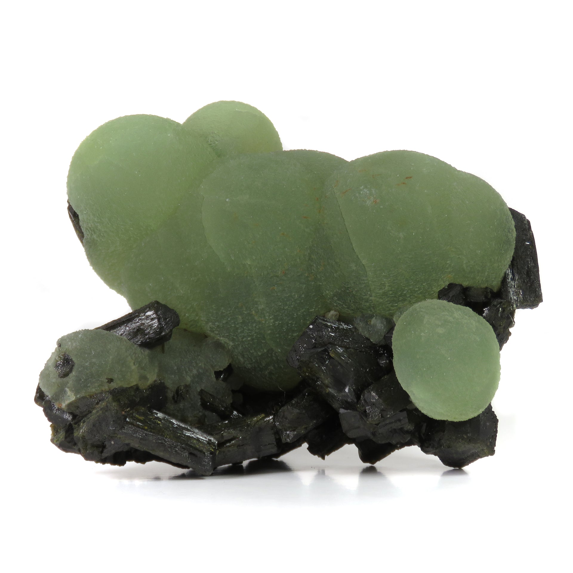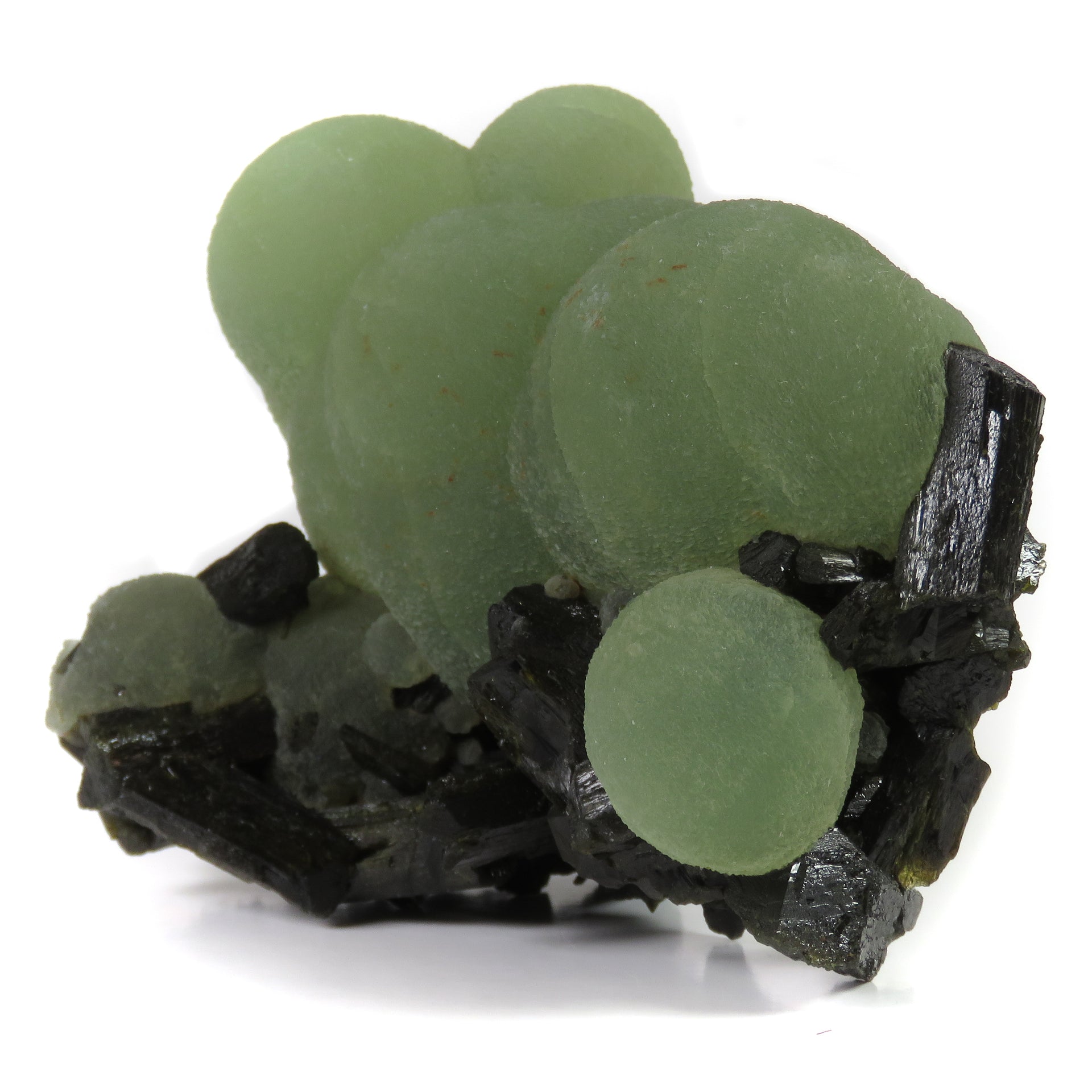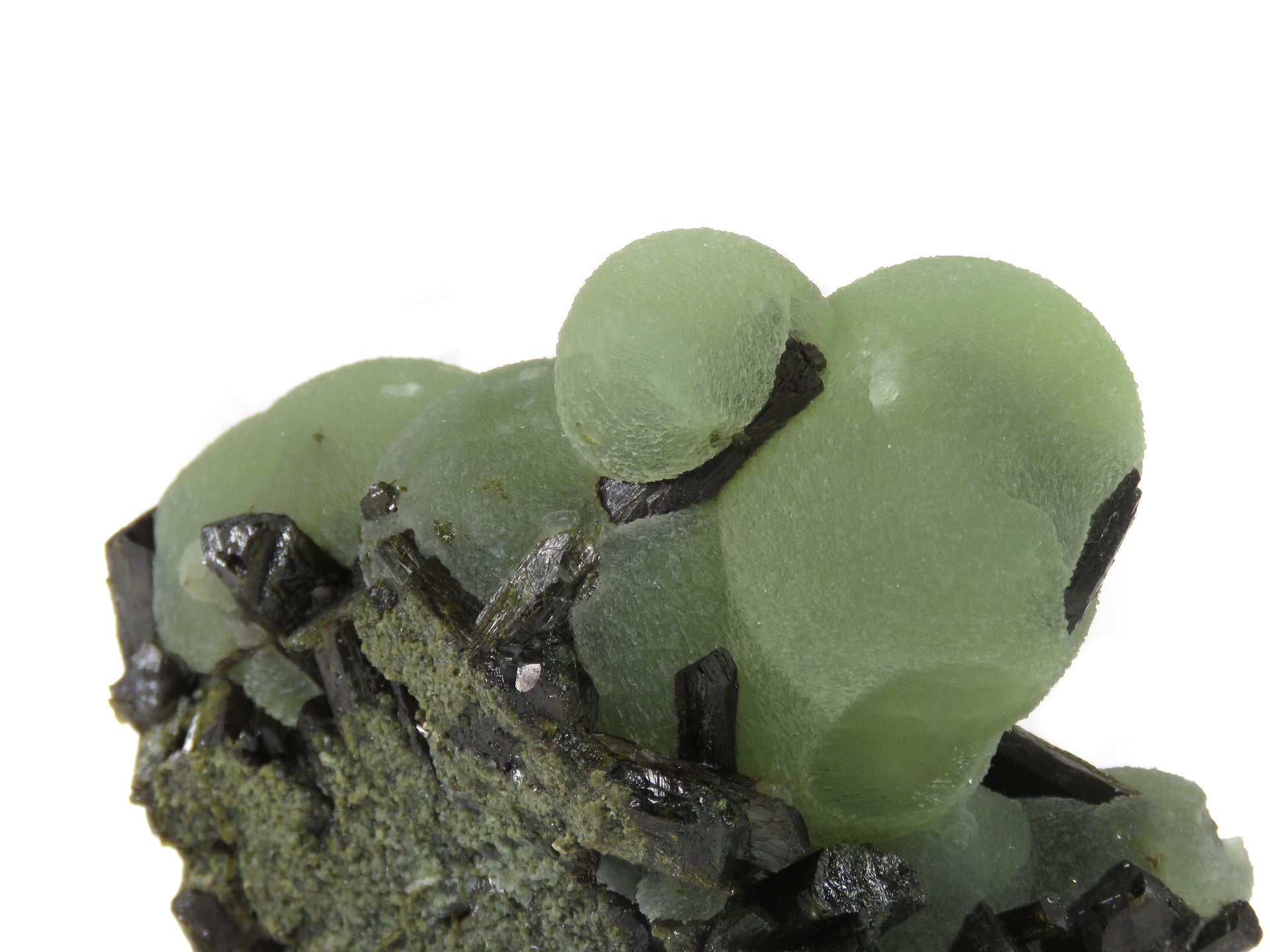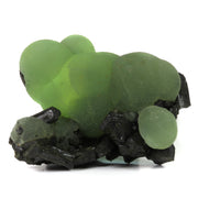 Aggregate of large, spherical prehnite grown together with prismatic epidote. When these specimens from Mali first hit the market in the mid 2000's, they became a big deal in the collecting world and the gold standard for this mineral combination, and this is easily one of the nicest I've seen. Many specimens were brought onto the market, and there were still hardly ever any with this outstanding quality and size. The color is some of the best of these finds, and when backlit correctly the glow is honeydew melon green. The epidote gives strong balance with the hues and creates a natural base along the bottom. On the backside you can see complete crystals of epidote embedded in between overlapping prehnite spheres, and many of the epidote here are doubly terminated. In fantastic condition, with barely noticeable points of contact on the top. There are also a couple of areas on the back where some epidote crystals were removed from the surrounding prehnite; I wouldn't even consider these damage and they add to the display in a positive way. Comes with a custom lucite base to prop it up and allow it to stand out in a cabinet.