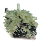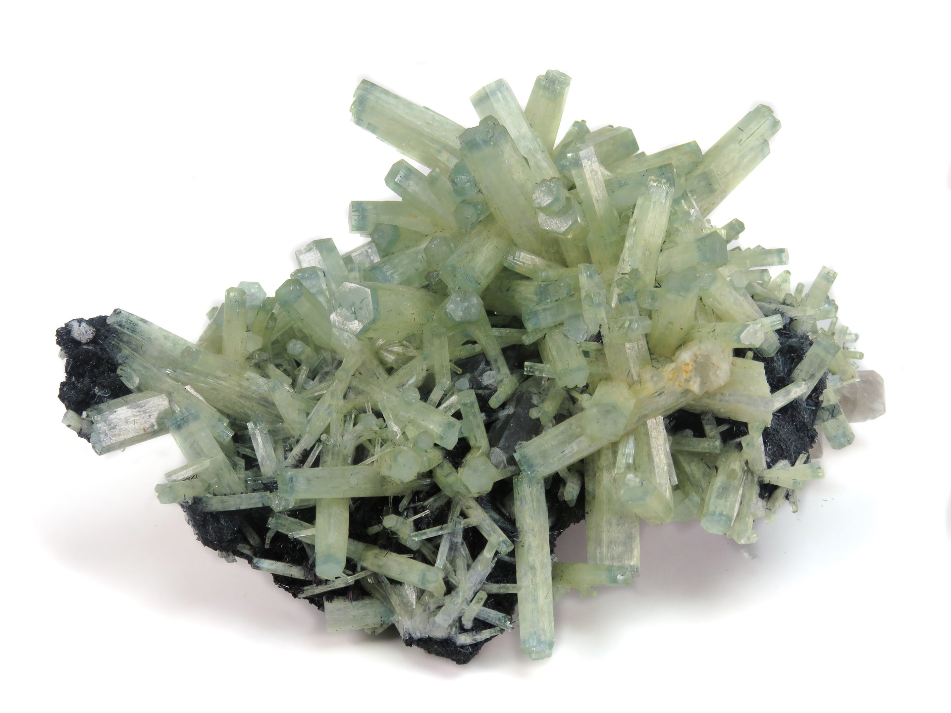 This distinctive style of beryl is a trademark of this Namibian region, characterized by crystals consisting mostly of goshenite (colorless) to heliodor (pale yellow), which are in turn capped off by light blue aquamarine terminations. The crystals here are scattered in all directions in jackstraw groupings, all embedded in a fine schorl matrix, with quartz and what may be fluorite off in the corner.