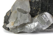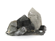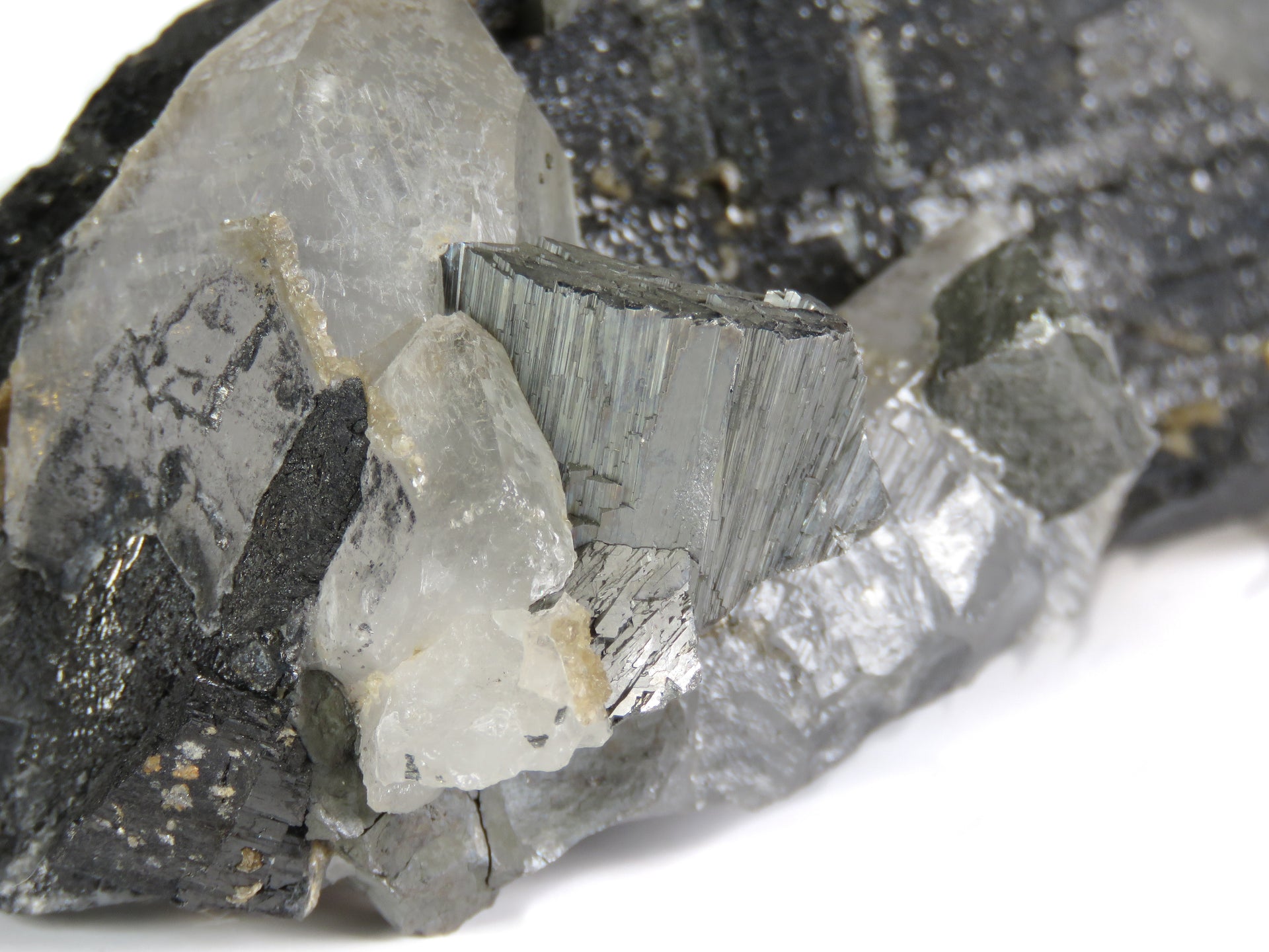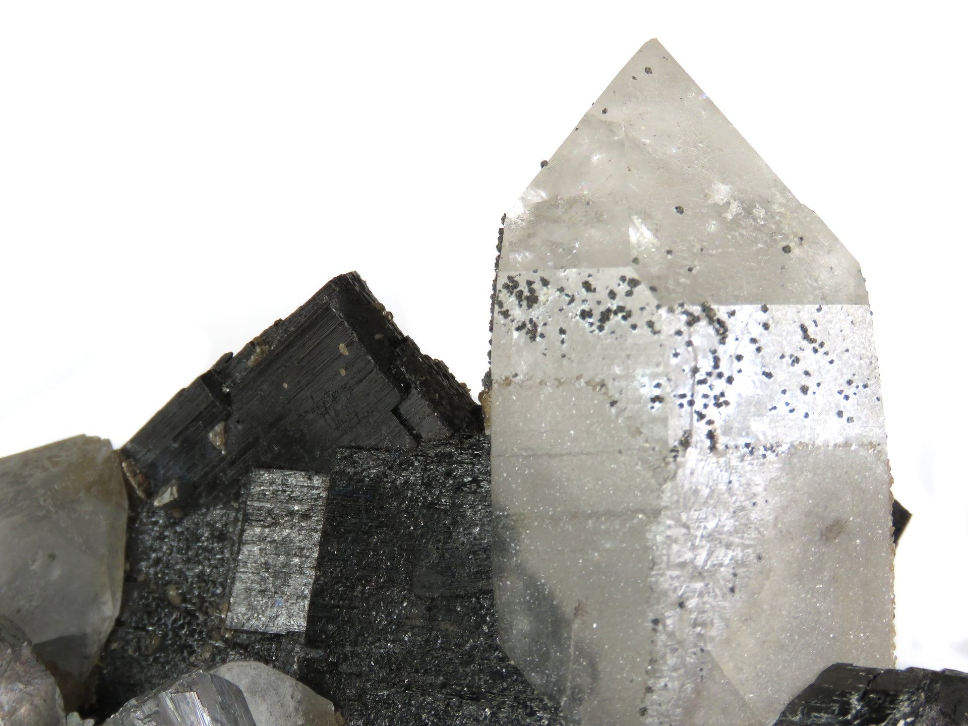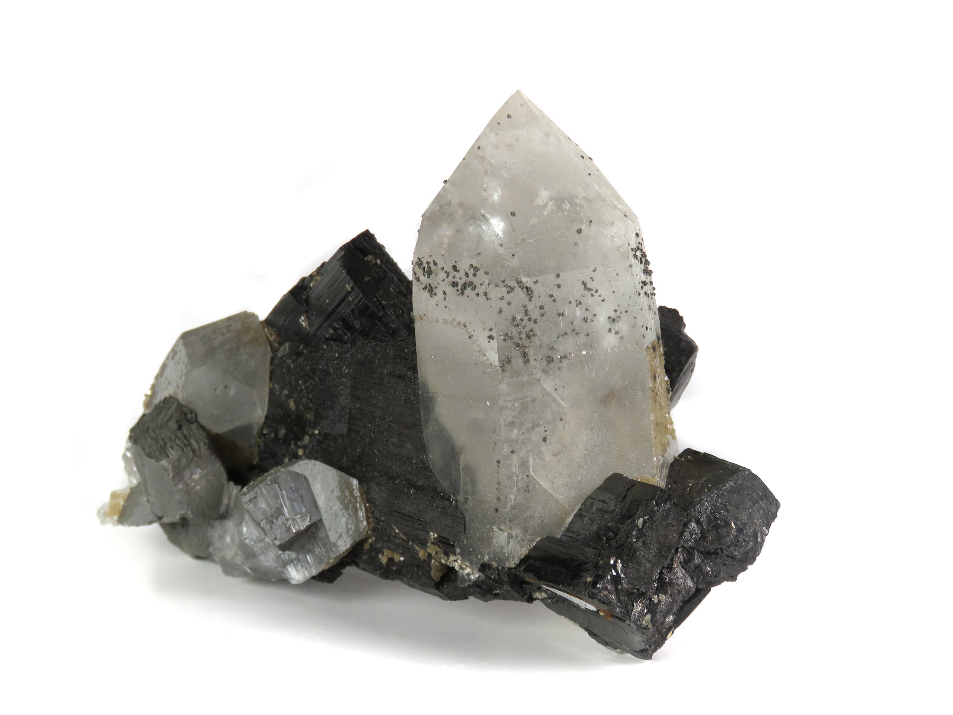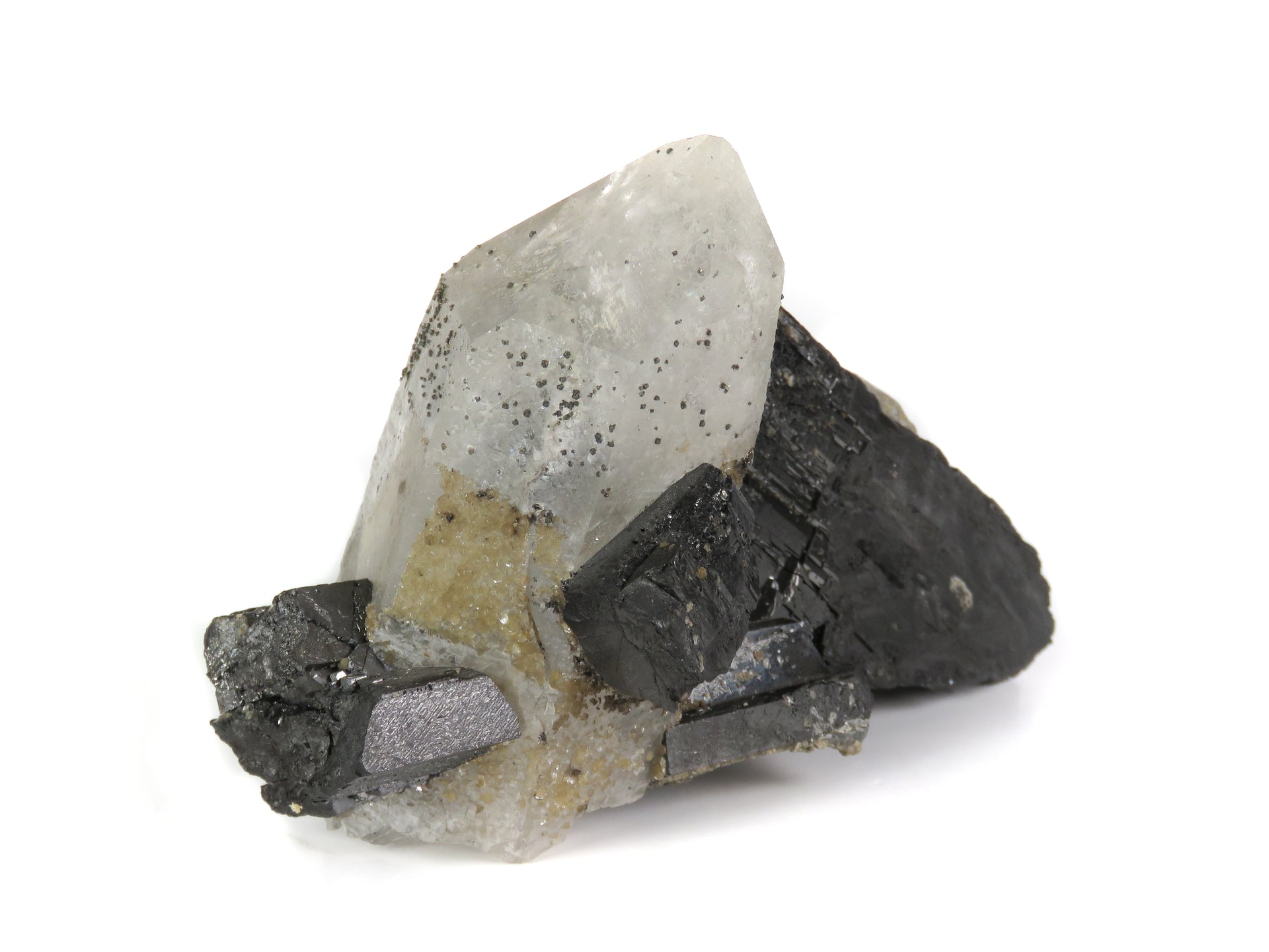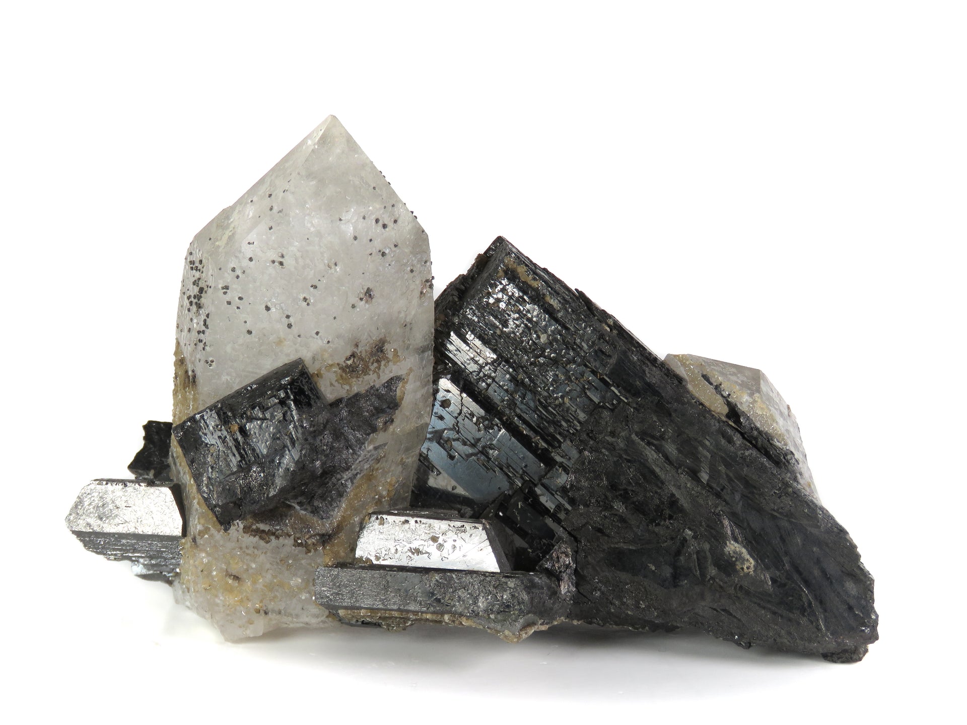 Beautifully balanced arrangement of large and highly lustrous ferberite, with a 7.5 cm quartz crystal set right to the side, with some of the ferberite visible through it. Sphalerite crystals are dotted along the faces of the quartz to give a dazzling accent, and there’s smaller crystals of quartz intergrown with lustrous arsenopyrite at the front. Together with these four minerals, one can also see growths of siderite all around the piece. This lovely Panasqueira specimen goes all the way back to the 60's or 70's, and is a fine representation of this combination. Ex. Kurt Hefendehl.