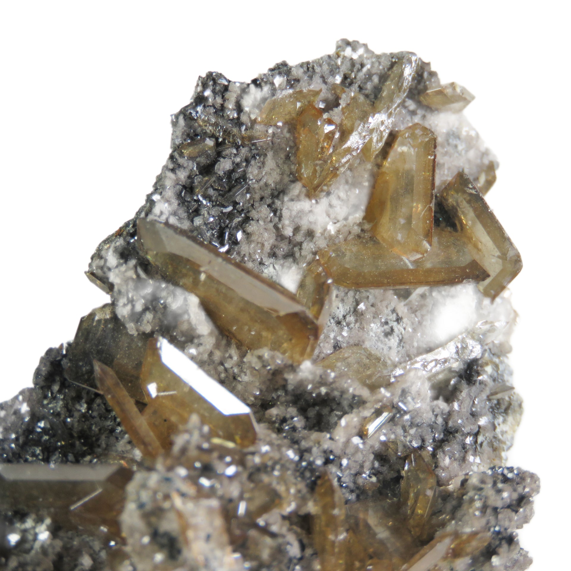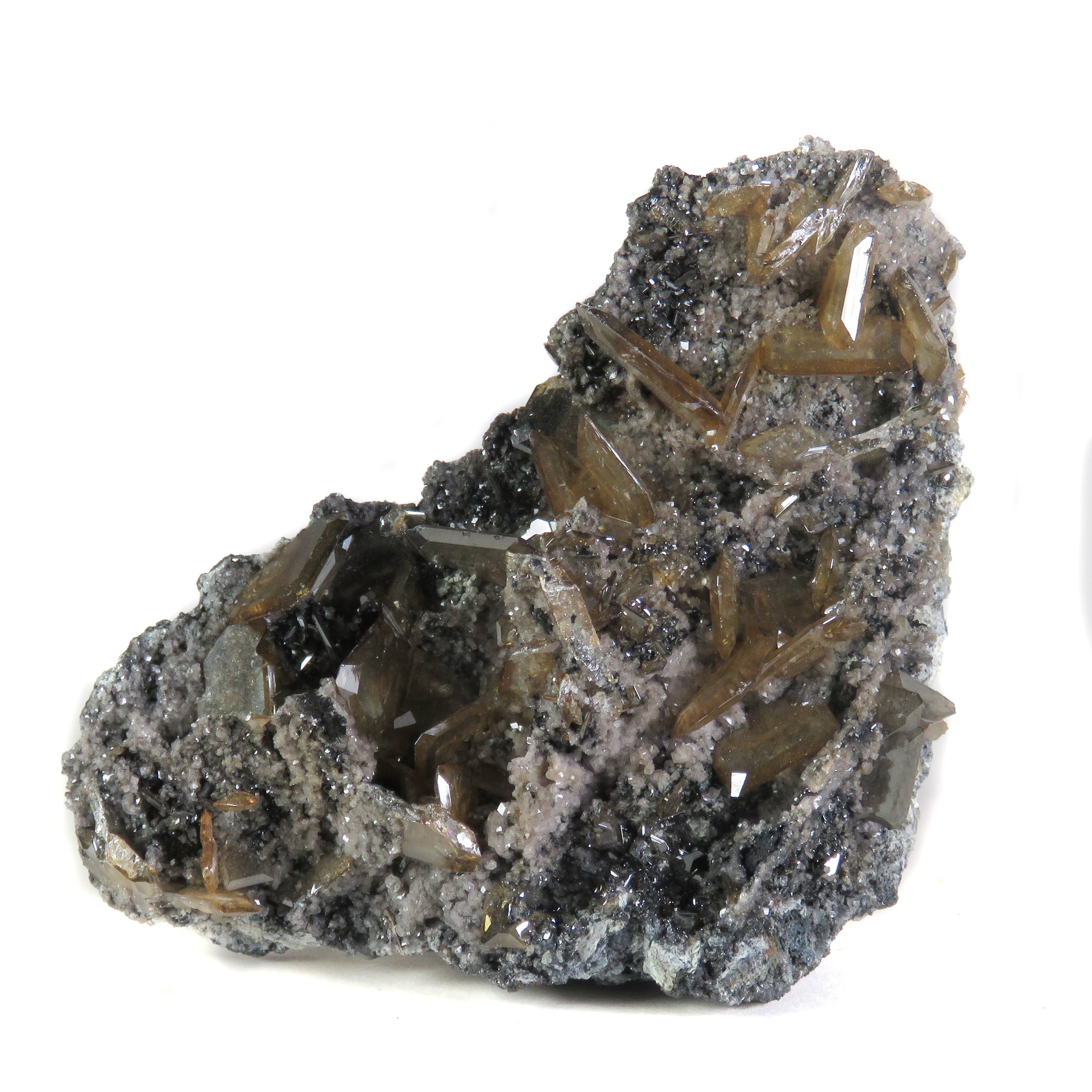Dozens of super sharp, light brown, water clear wulfies sitting on top of a dark matrix. These blades are well defined for the iconic Tsumeb Mine, with sharp beveled edges, and their color is characteristic for the locale. Many of them are pristine, only a couple broken crystals and some with minor edge wear. A few of the crystals diffract light into rainbow prisms, so under the right lighting this is a super colorful specimen!