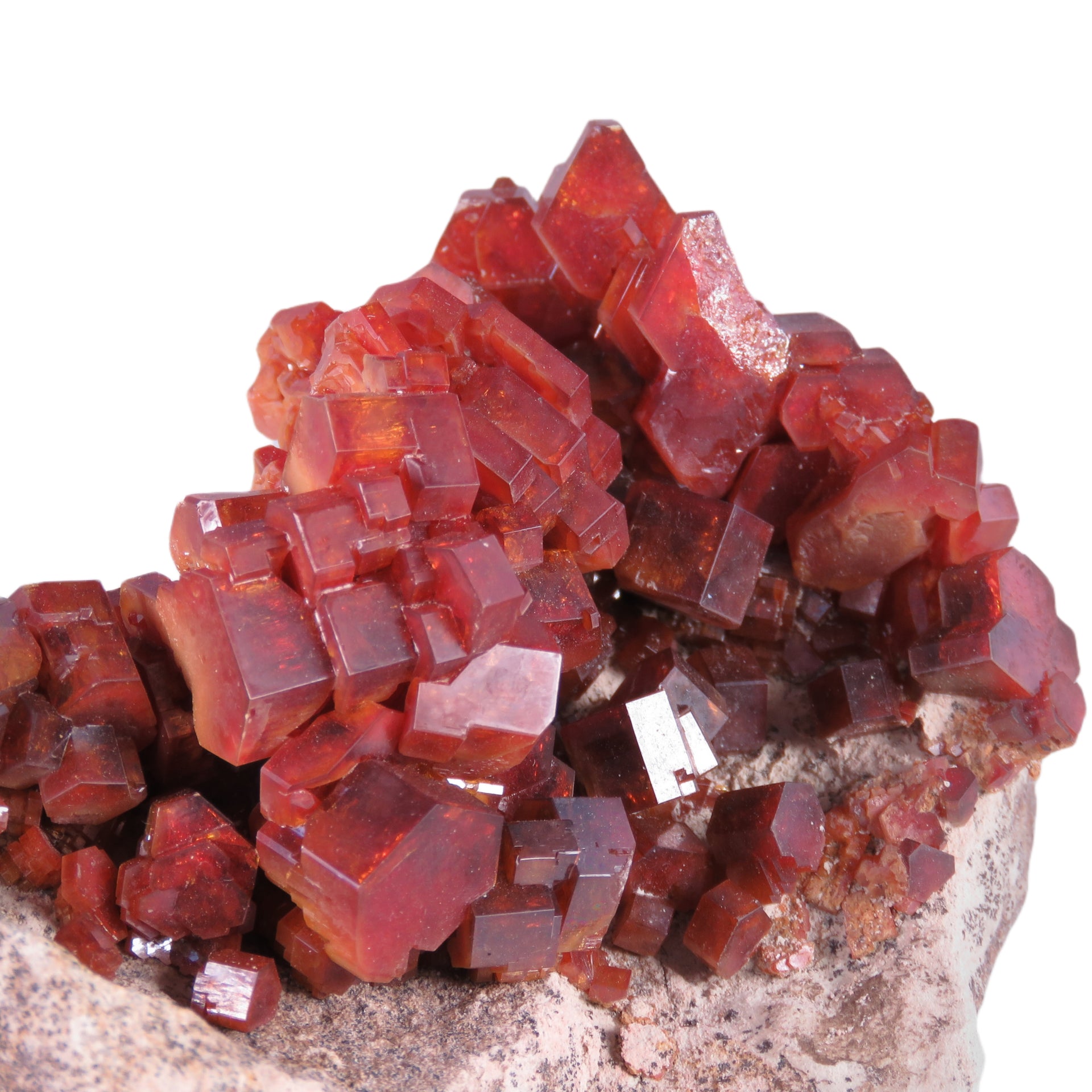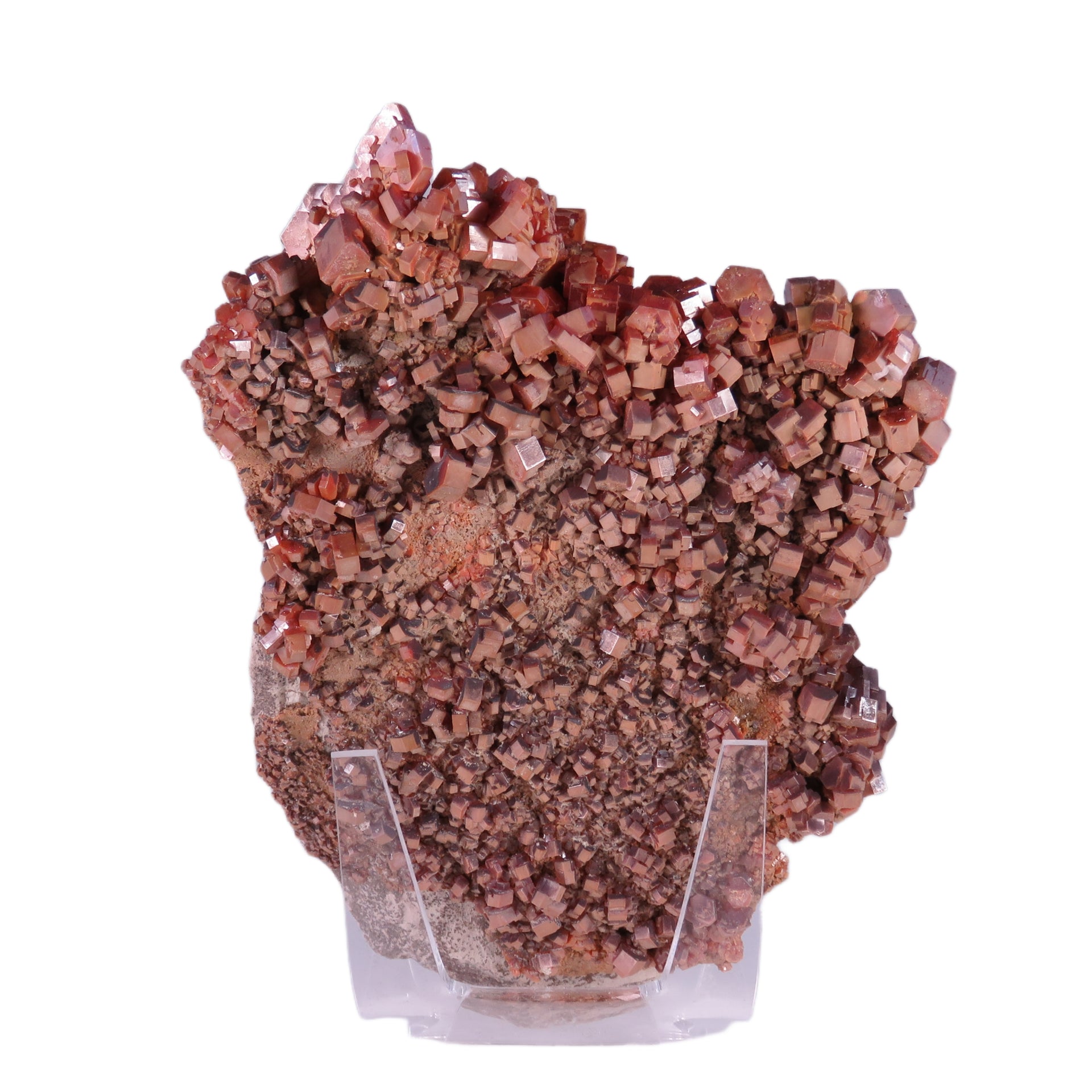 Large, partially elongated crystals of rich red vanadinite on top of a tall slab of host rock. The contrast between these two elements, combined with the large dimensions, make for an ensemble that quickly catches the eye.