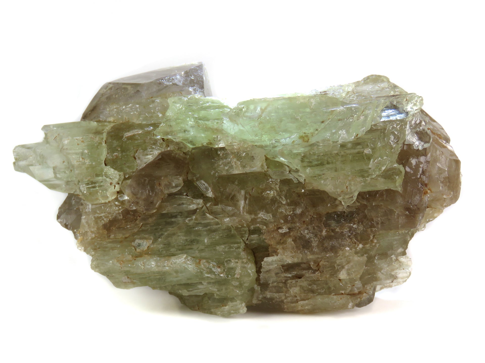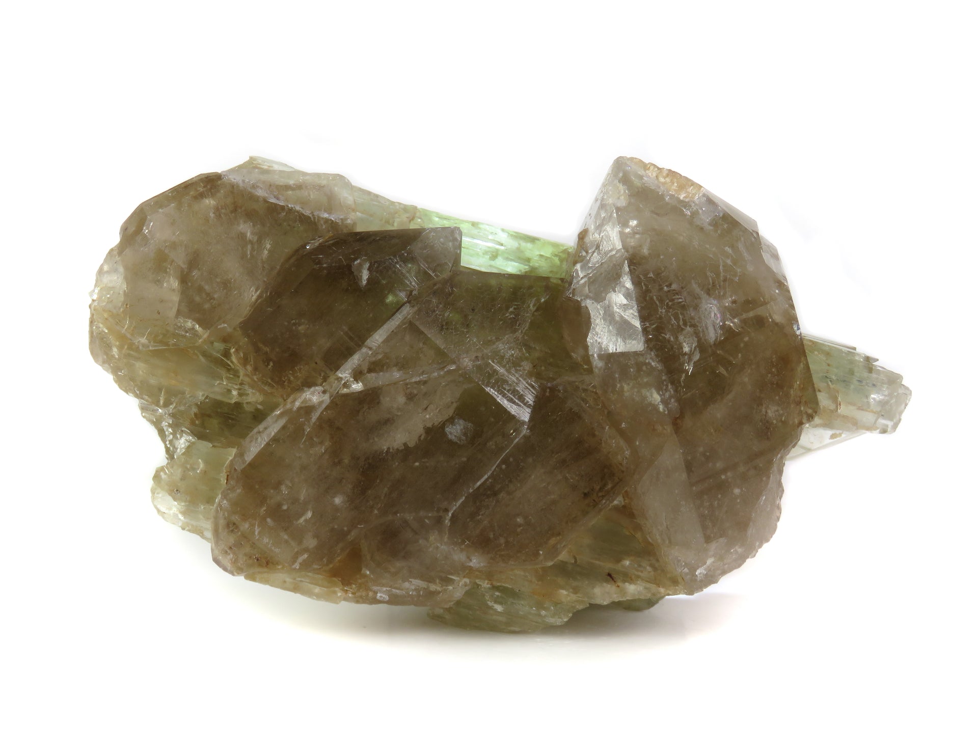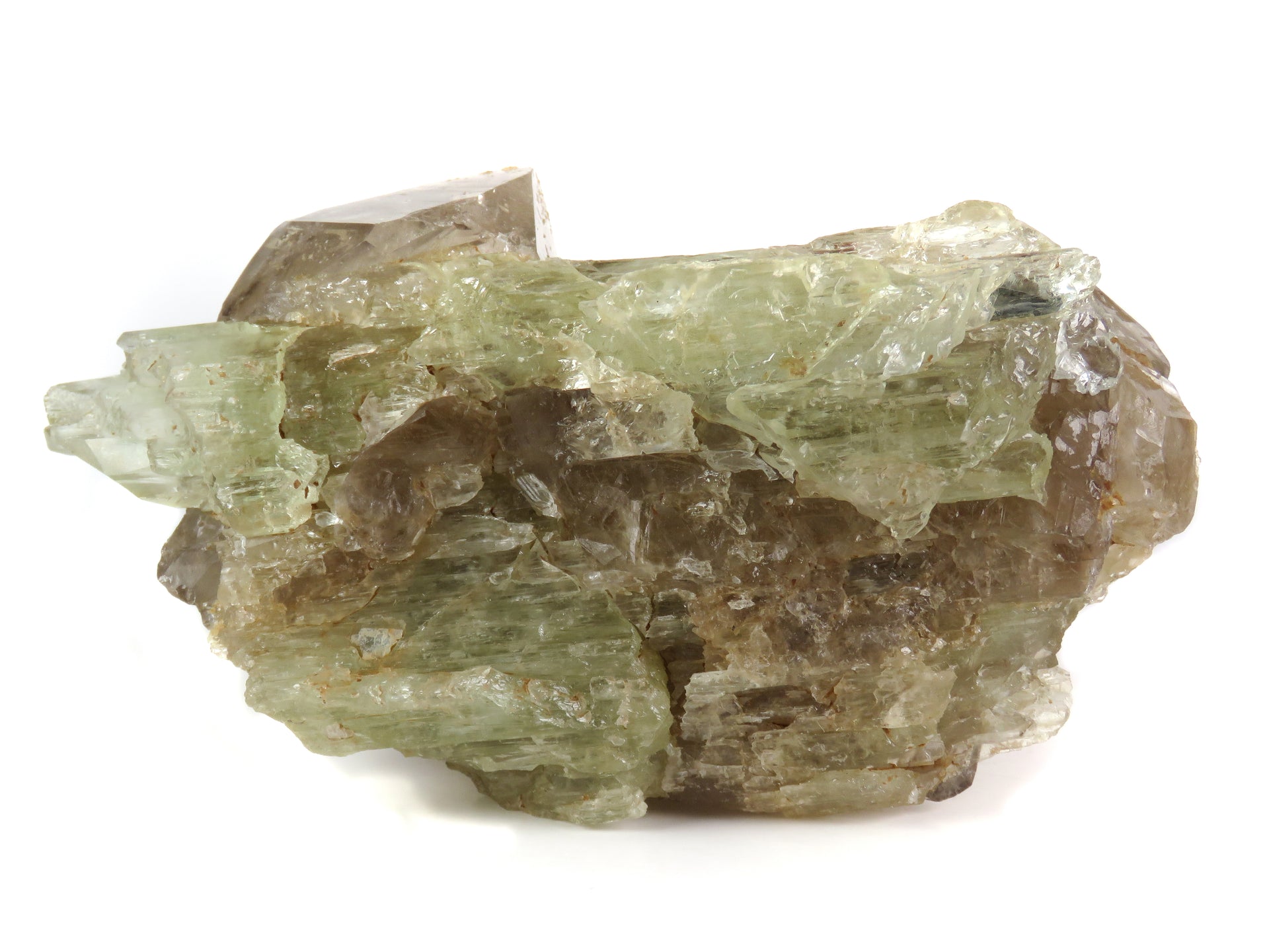Fascinating combo piece, with a grouping of smoky quartz crystals grown right atop a large crystal of spodumene var. triphane! The triphane has a vivid yellow-green coloration with sharp terminations, and the quartz has such high clarity in places that it allows one to see the triphane right behind it! It can be well displayed from every angle, and is a marvelous example of a unique combination that is normally seen in much lower quality. This comes from a lesser known locality, for which Mindat doesn't even have any photos listed.