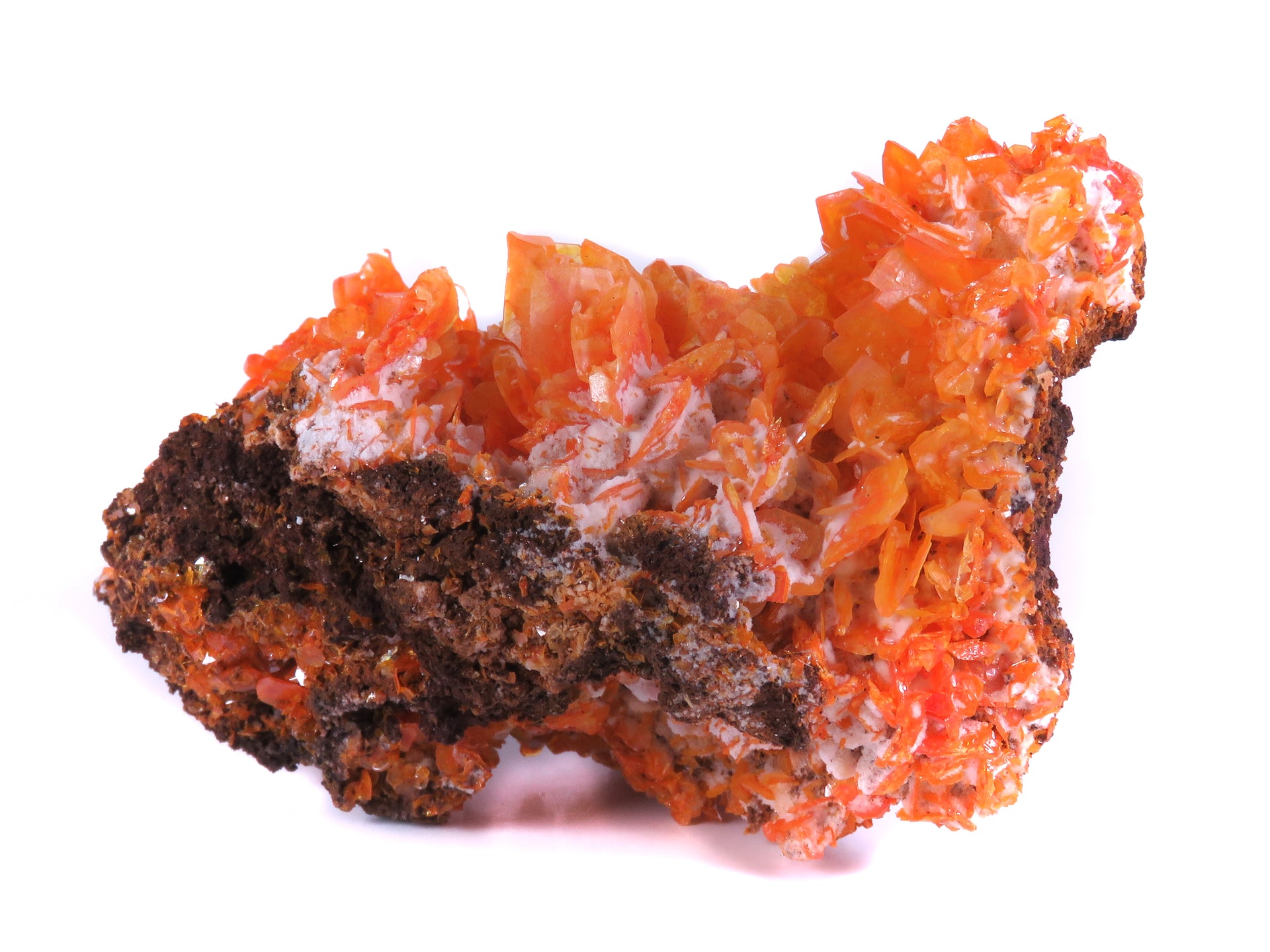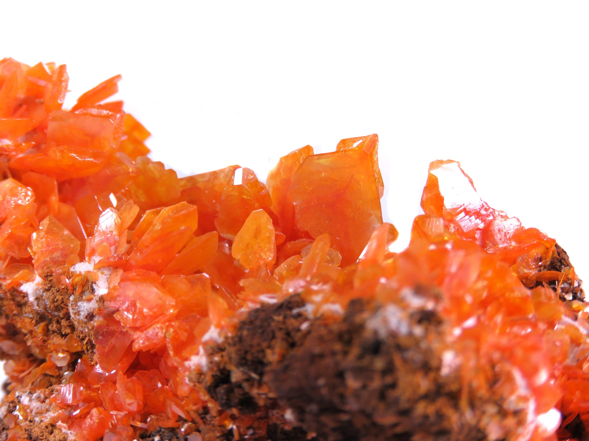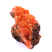Fiery orange wulfies on matrix from the Ahmad Abad Mine in central Iran, a locality that has quickly become a legendary one for the species. Originally beginning production around 200 years ago, it was rediscovered for specimen mining in the last couple decades before the tunnels were collapsed a few years ago, making the mine nearly inaccessible and likely destroying the vast majority of the remaining specimens. The intense orange hues represent the very best color of these finds, as most you'll see from here are beige to pale orange - only a couple of pockets produced specimens like this. What's really interesting is the different habits visible. Some are more thin and platy, characteristic for this locale, some are a little thicker with beveled edges reminiscent of Arizona wulfenites, and in a couple cases you have multiple crystals intergrown to produce one larger piece. Displays beautifully from multiple angles.