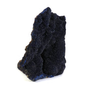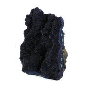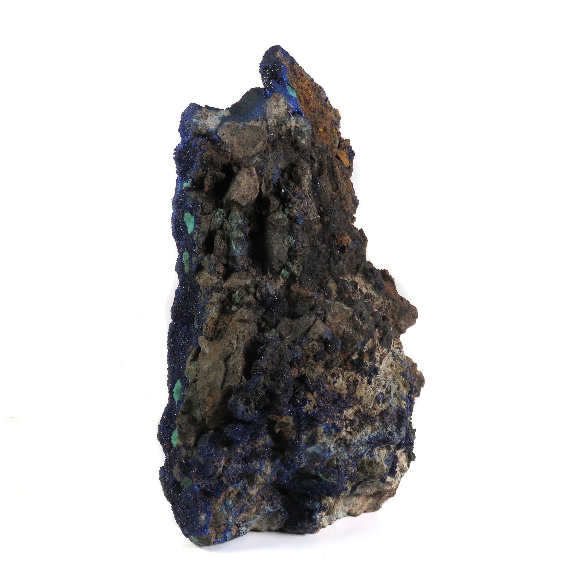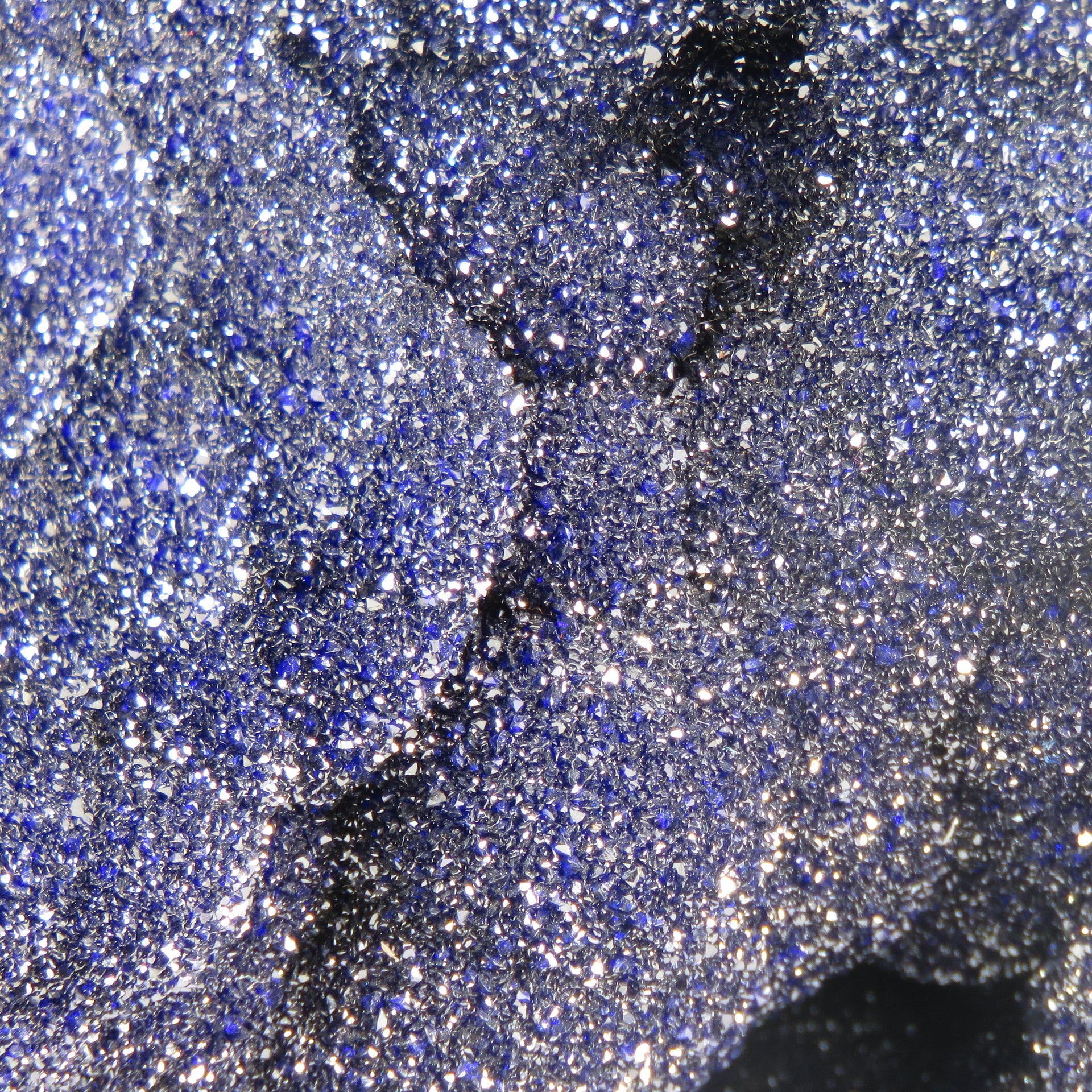 Uncountable tightly packed crystals of azurite with an amazingly starry luster and a deep midnight color, all packed into a three-dimensionally formed vug. Bisbee is world famous as a historically great producer of azurite and malachite, and this represents a particularly coveted style from this prestigious mining district. Aside from the central vug, one side reveals a cross section of azurite with cores of malachite packed into individual nodules. The back, consisting of matrix with bits of azurite and malachite showing, provides the perfect complement to the crystallized frontside. Although hard to display even with video, the luster is stunning, especially in sunlight.