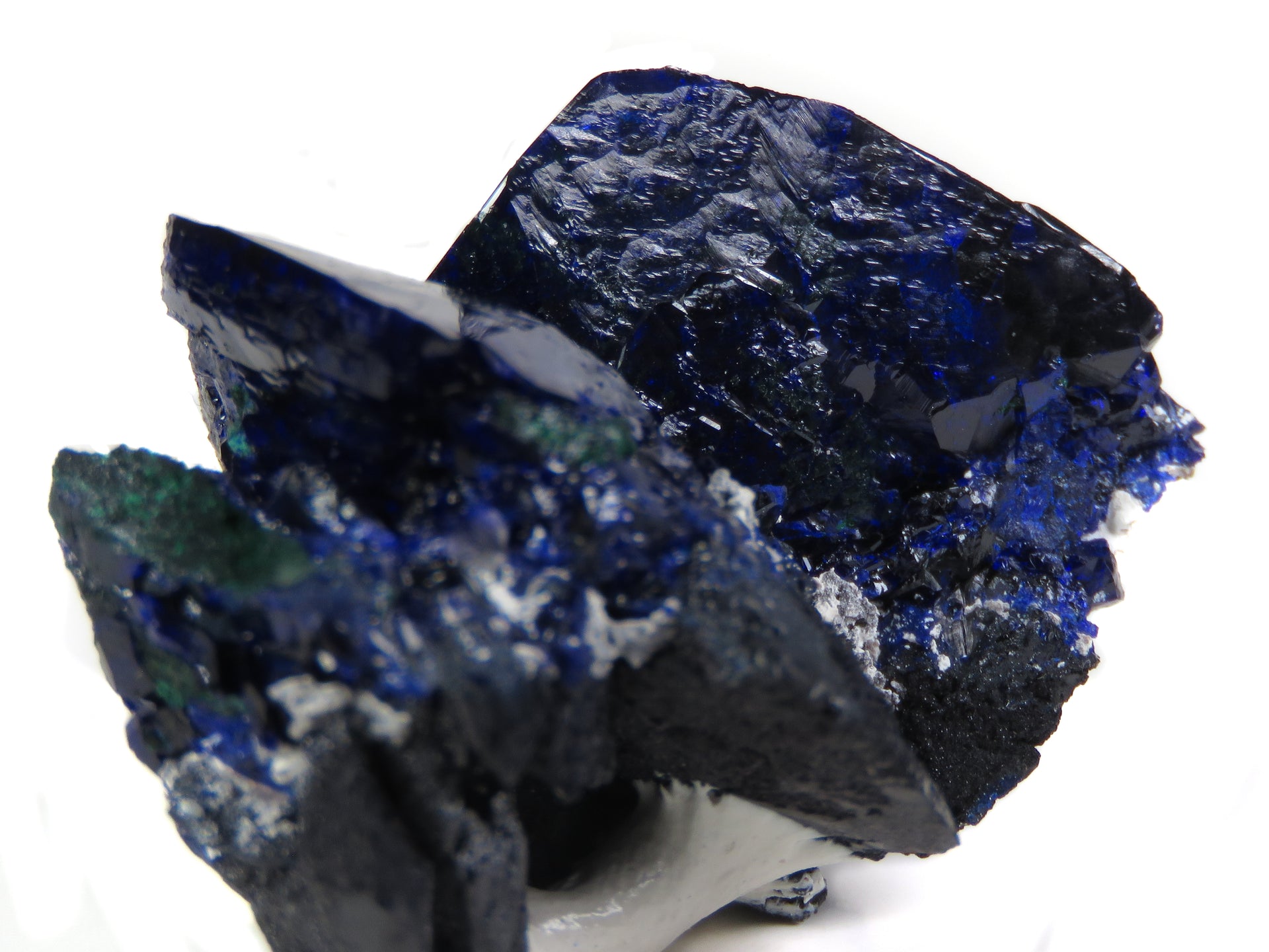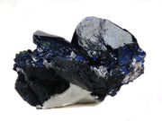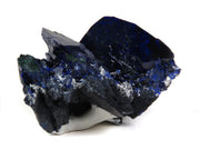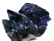 Fantastic Milpillas miniature with a grouping of highly lustrous, electric blue blades, with the largest measuring to an inch in both length and width. There's another crystal measuring over an inch, along with chatoyant malachite along the side where it's started to pseudomorph the less crystallized azurite. Under direct lighting the color is super vivid, and the main crystals are both in excellent condition.