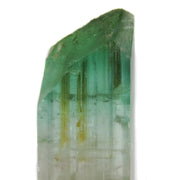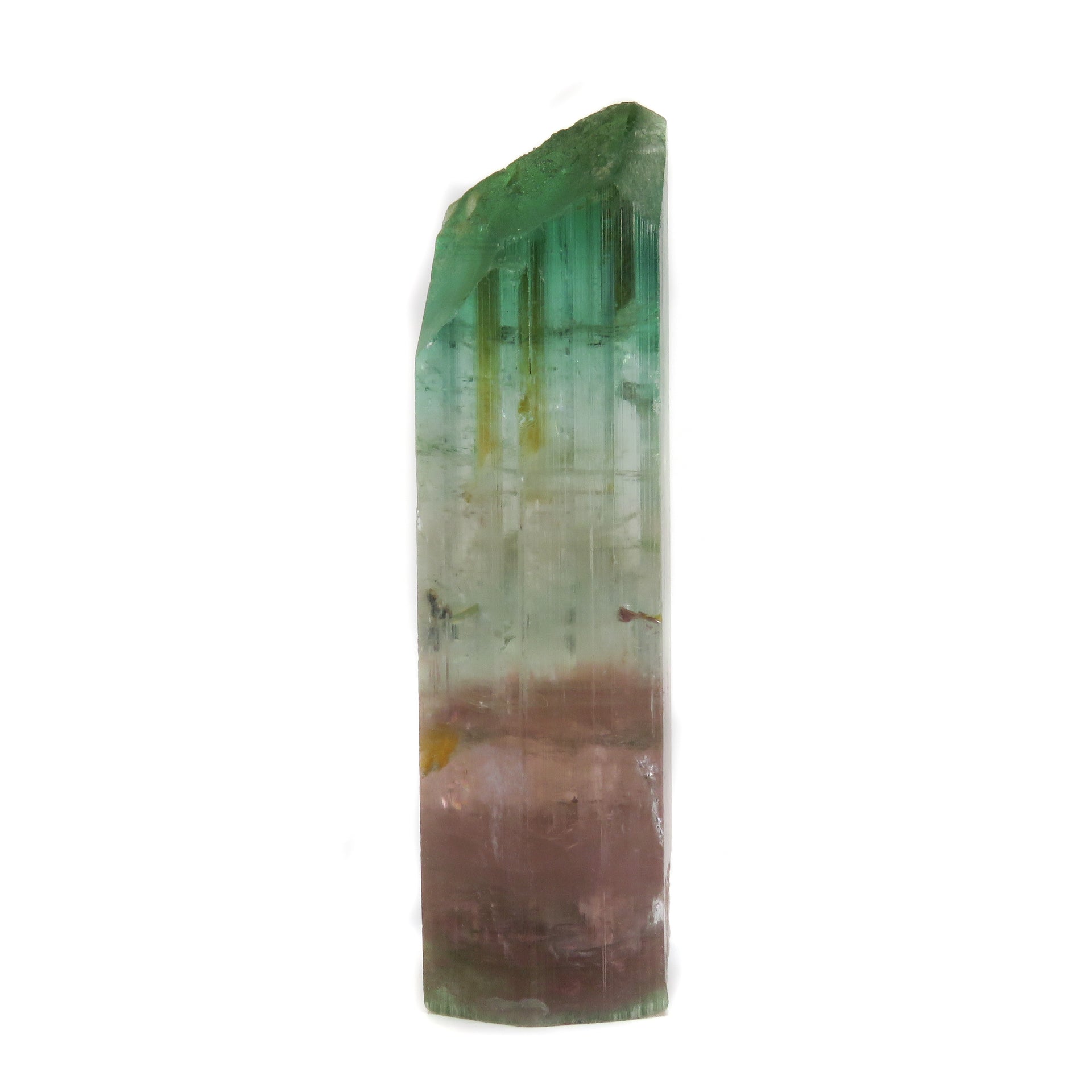 True eye candy of a tourmaline specimen: a large, doubly-terminated single crystal with vivid color zoning from end to end. At the top is a sharp termination with vibrant green coloration, which gradually fades to a more subtle blue-green hue. In the middle is a band of achroite (colorless tourmaline) which possesses gem clarity, giving way further down to another section of light blue color. Approaching the other end, the color turns to a rich pink, with another thin layer of green all the way on the pinacoidal termination. This crystal comes from newer finds in Nigeria, and the size and gemminess makes it a real standout.