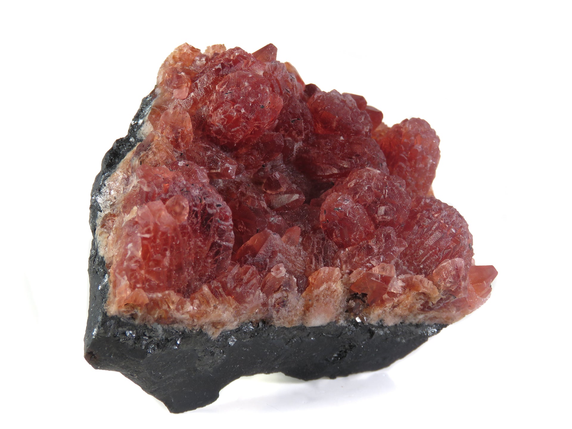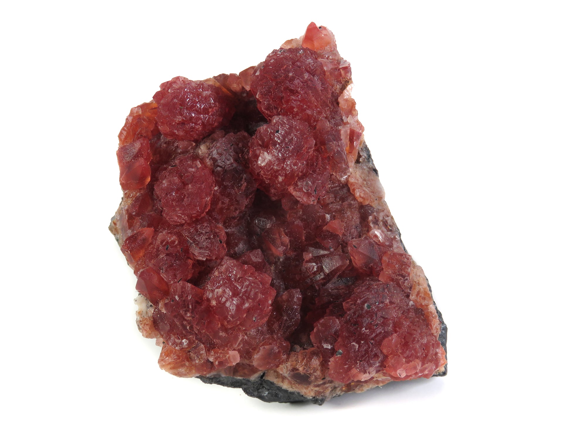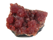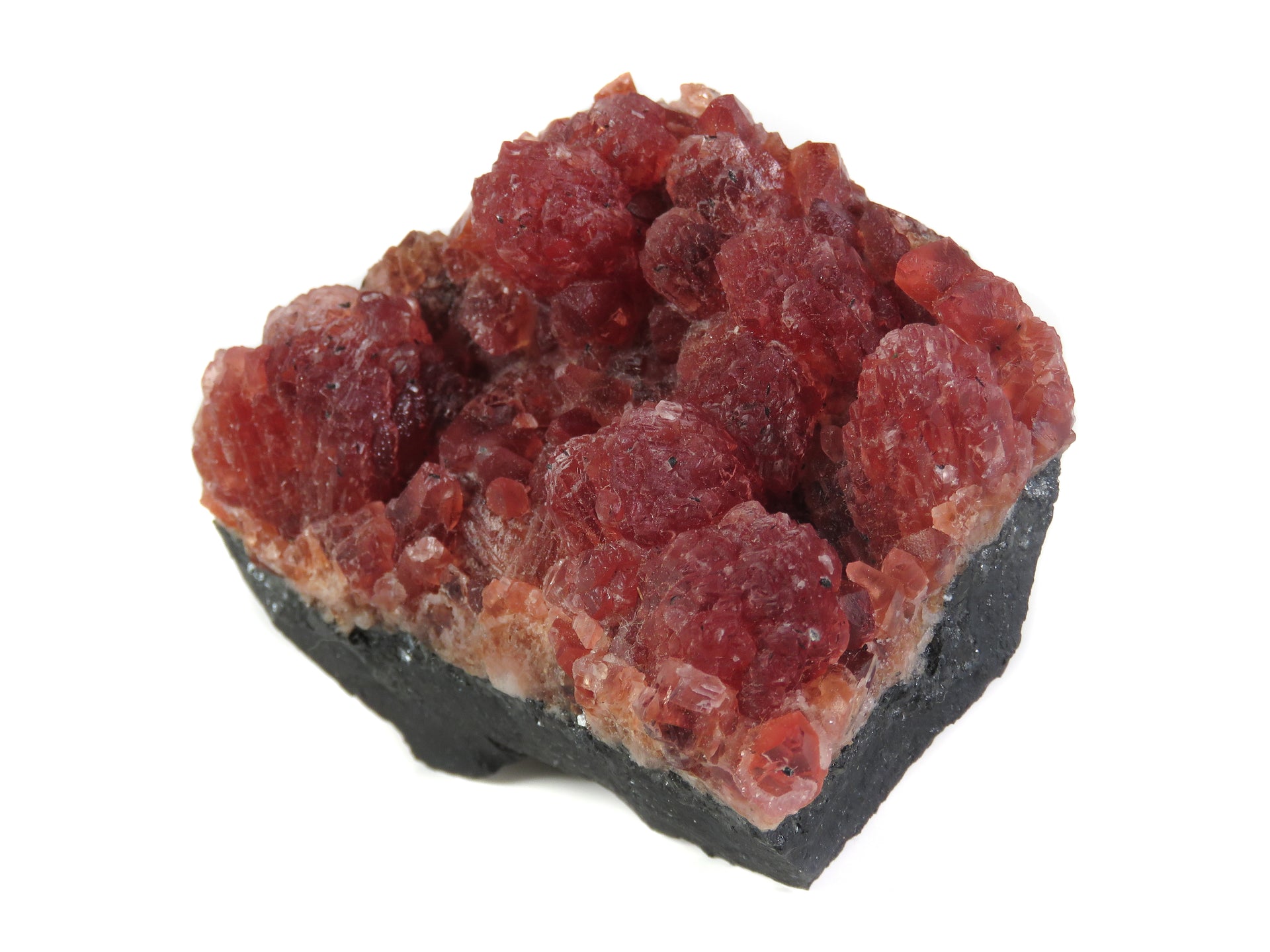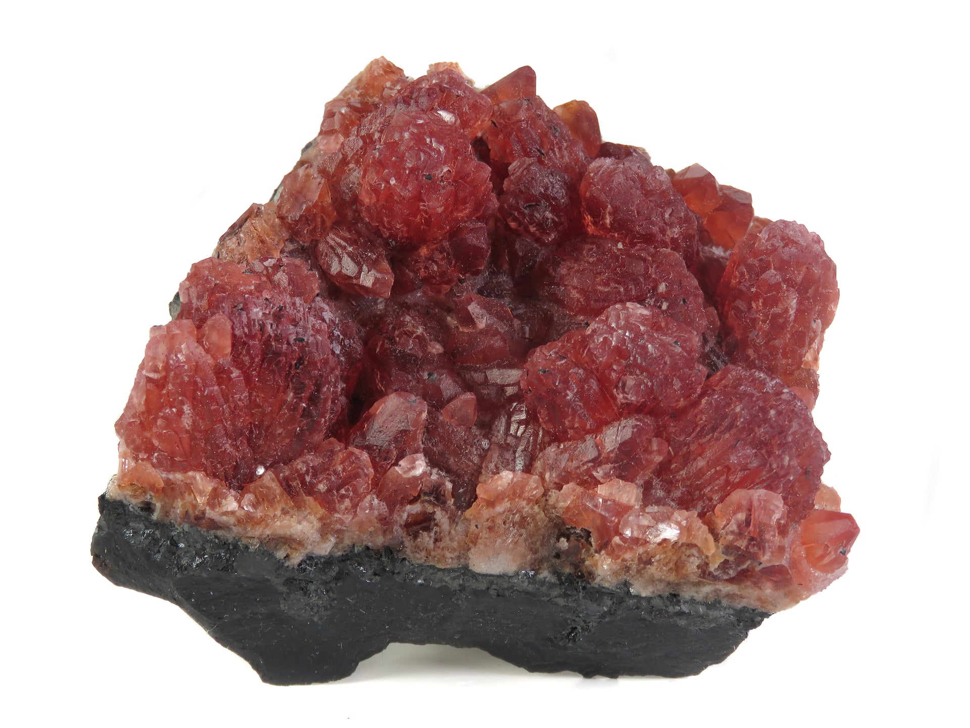 Full coverage of gemmy, rich, raspberry red rhodochrosite hosted atop a bed of manganite matrix. A majority of the crystals are formed as tightly bunched clusters of scalenohedra which are truncated to give the tops of the clusters an almost rounded look, while still showing sharp faces along the sides. Some tiny quartz growths are visible atop the crystals and around their bases. This particular growth style is both highly desirable and characteristic for the Hotazel Mine, which preceded the finds at the N'Chwaning Mines. Individual scalenohedra are also present throughout, and the excellent translucency makes it absolutely glow with backlighting! Although it was sold to us as having come from the N'Chwaning mines, we can, again, say that it's almost certainly older Hotazel material based on style. Some very minor nicks and edge wear are present, yet it feels like splitting hairs to mention, considering in how good of condition it is for this material. For a locality whose specimens frequently reach five- and six-figure range prices, this is an excellent and more affordable example.