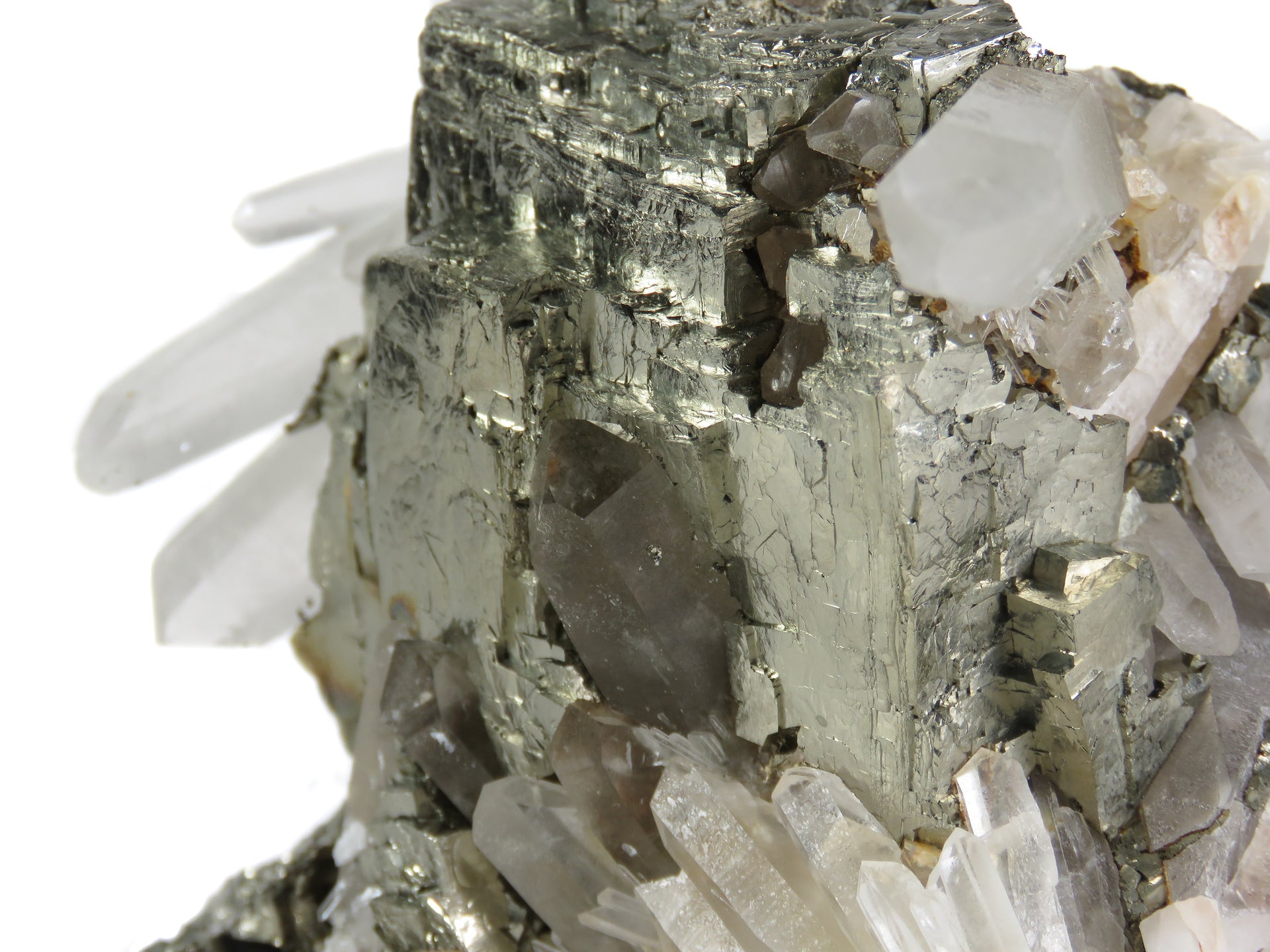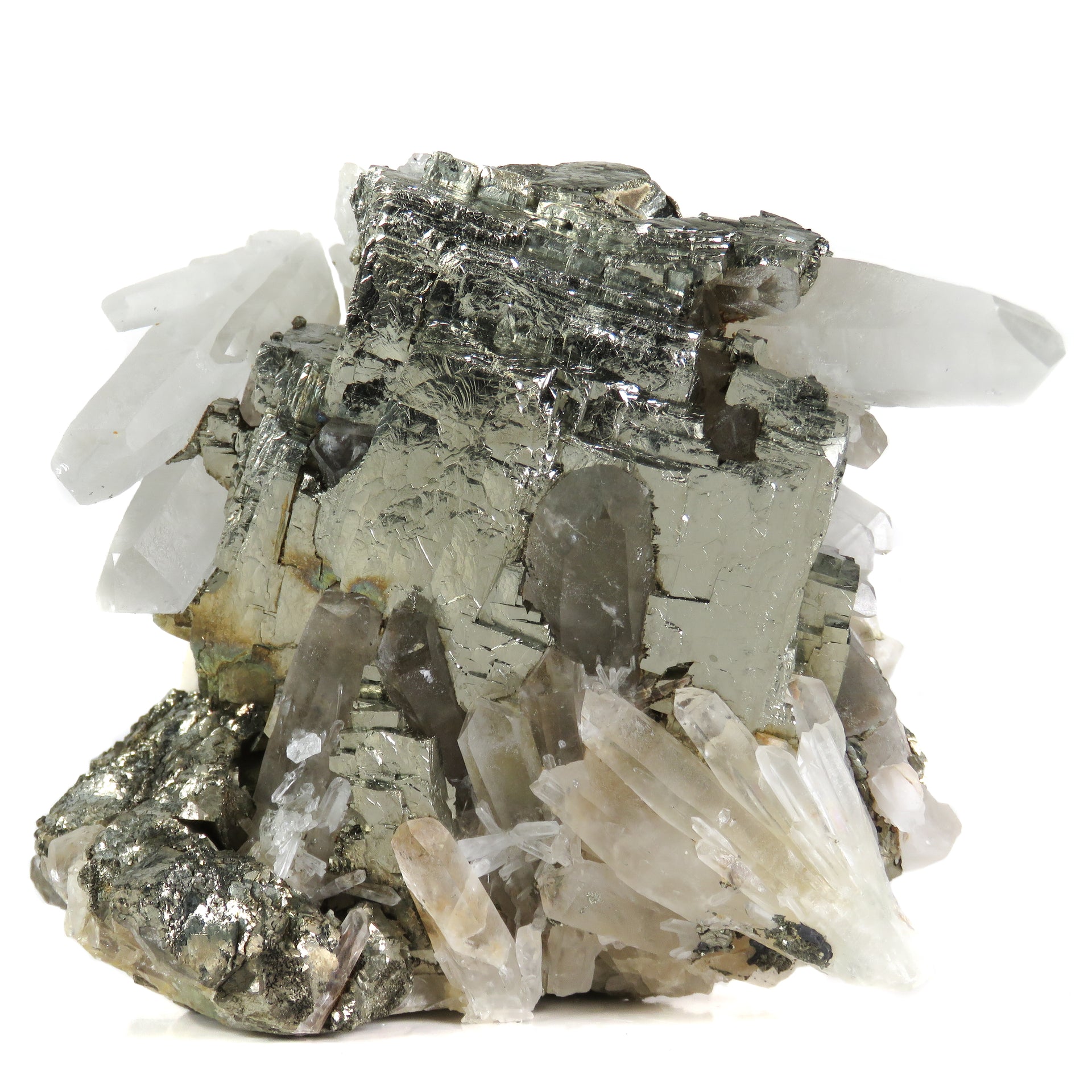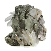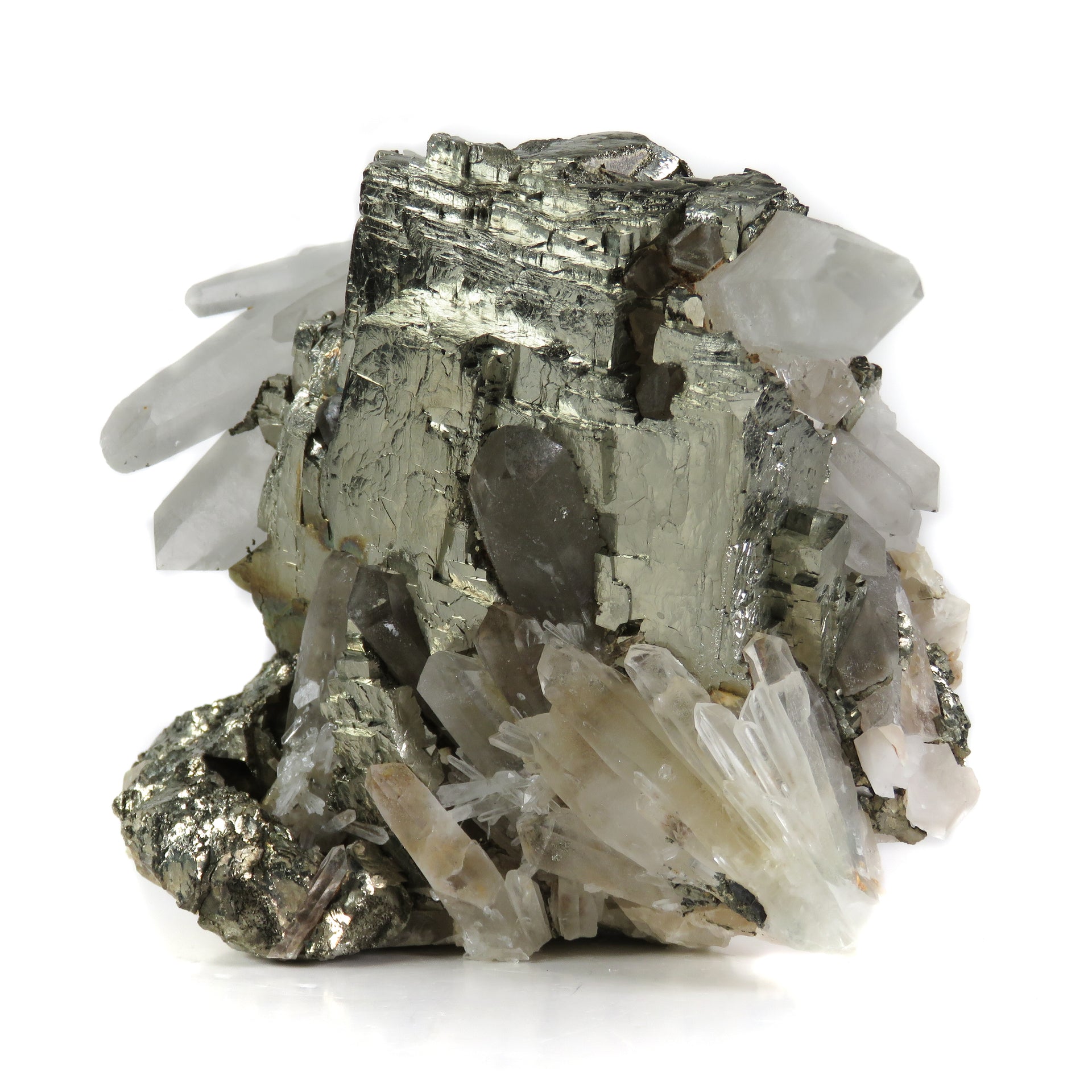 Brilliantly lustrous pyrite takes center stage on this small cab specimen, dramatically framed by radiating quartz crystals. The pyrite's complex surface features natural cavities, later filled by both clear and smoky quartz crystals, creating an intriguing interplay between the two species. This unique crystallization sequence produces a fascinating play of light, as the nested quartz crystals change the roll of the luster across the front. Essentially all of the quartz on the display side is pristine, and any broken points can easily be hidden out of view. This is those specimens that, for composition and peculiarity, stands as more than the sum of its parts.